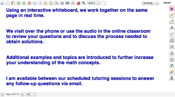 During our initial, free consultation, I will work with you to describe and demonstrate how we work on the same interactive whiteboard page. We will work some sample problems together to help you get a feel for the tools of the whiteboard. Other than becoming familiar with using a digital tablet and pen (if you choose to use these tools), most students find online tutoring to be very similar to working with a teacher or tutor face-to-face at a desk or table using pencil and paper.